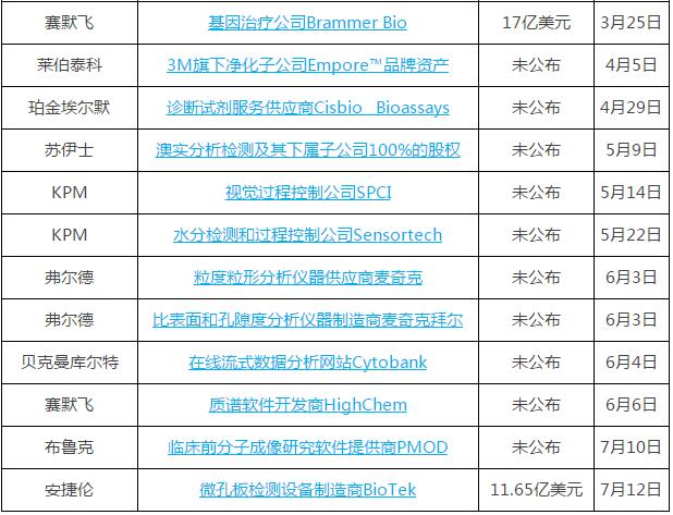 了安捷倫,丹納赫、賽默飛、弗爾德、珀金埃爾默、萊伯泰科等儀器廠商上半年也貢獻了多筆精彩收購,最大一筆交易的金額甚至達到了214億美元。下面來看科學儀器行業資本運作的“年中小結”。
