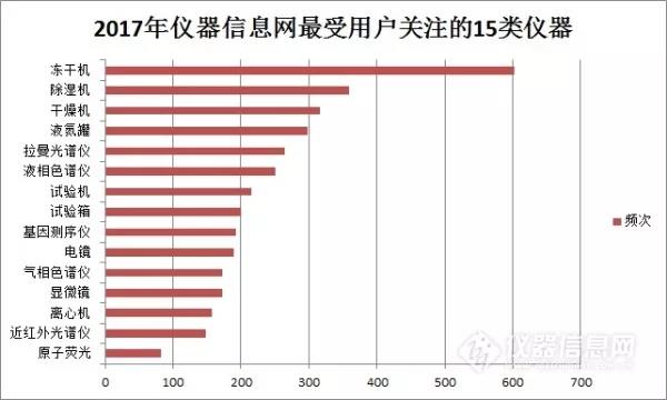 2017年,儀器信息網(wǎng)資訊欄目最受用戶關注的是凍干機、除濕機、干燥機、液氮罐、拉曼光譜儀等15個儀器類別,其中5類屬于實驗室常用設備,光譜儀3類,色譜儀、物性測試儀器、光學儀器各兩類。2017全年含“色譜”二字的關鍵詞共出現(xiàn)1007次,“光譜”出現(xiàn)877次,“質譜”出現(xiàn)646次。