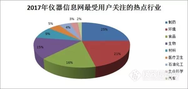 從數(shù)據(jù)可以看出,2017年儀器用戶關注的熱門領域仍在制藥、環(huán)境、食品三大行業(yè),這與儀器信息網(wǎng)行業(yè)應用欄目解決方案的增長趨勢不謀而合。2017年,資訊欄目“制藥”關鍵詞出現(xiàn)2330次,“環(huán)境”出現(xiàn)2000次,“食品”出現(xiàn)1520次,其后分別是生物、材料、醫(yī)療衛(wèi)生和石油化工等。