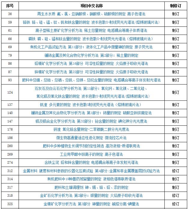 擬立項的國家標準中有35項為儀器分析方法,涉及離子色譜、ICP-MS、ICP-OES、原子熒光、氣相色譜、液質聯用、微流控芯片等。清單如下: